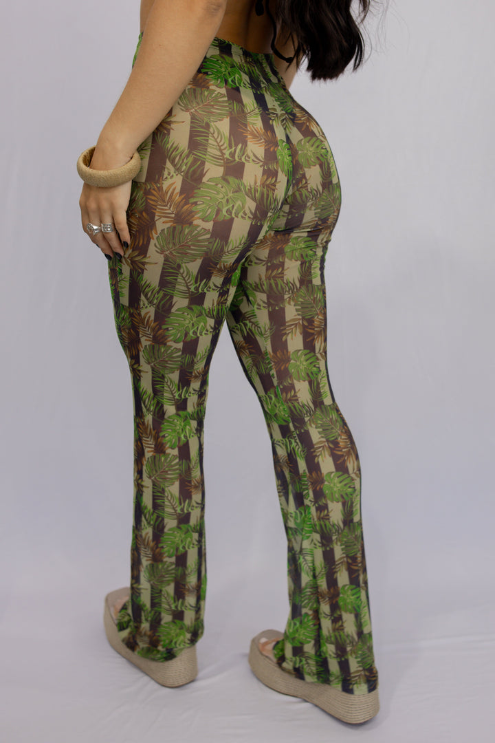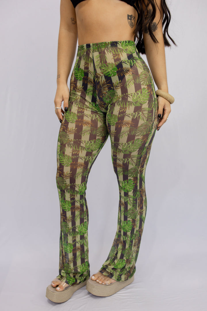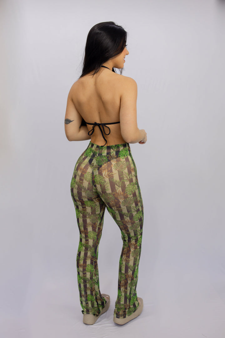 CALÇA FLARE TULE LISTRADO FOLHAS